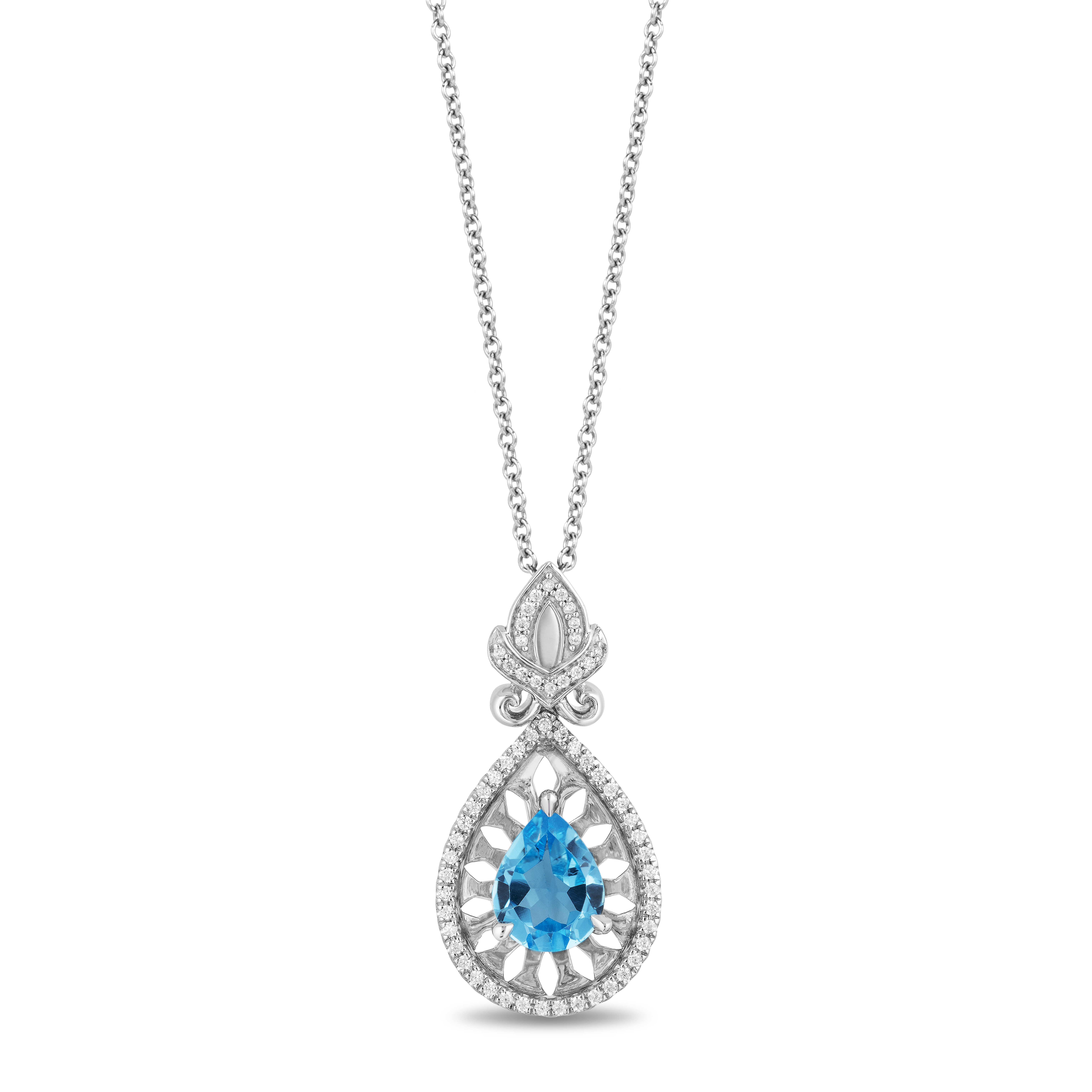 Enchanted Disney Jasmine Sideways Pear Shaped Blue Topaz And 1 10 Ct T W Diamond Peacock Feather Necklace In 10k Gold Zales Outlet